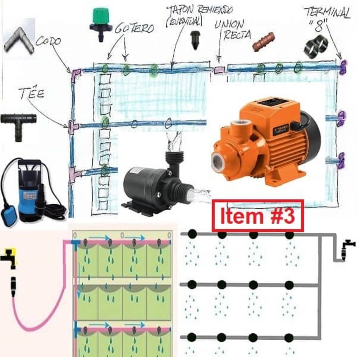 Básicamente su decisión de regar con grifo o bomba determinarán los posibles componentes de un sistema de riego y sus accesorios. En primer lugar una RED en 12 mm o 16mm con goteros simples 2LPH, 4LPH o del tipo flujo regulable para las bajas presiones de bombas sumergibles pequeñas. Seguidamente una RED en 12 mm o 16mm con goteros PC autocompensados y antidrenantes de 2LPH o 4LPH para las mayores presiones de un grifo de acueducto. También bandejas de drenaje o recolección del agua para riegos con grifos donde el agua que cae por gravedad no vuelve a recircular. Y al contrario tanques metálicos como depósitos de agua para los riegos con bombas donde el agua sí recirculará. Mientras que en el caso de las bombas son varias opciones según los caudales y elevaciones requeridas por cada sistema.